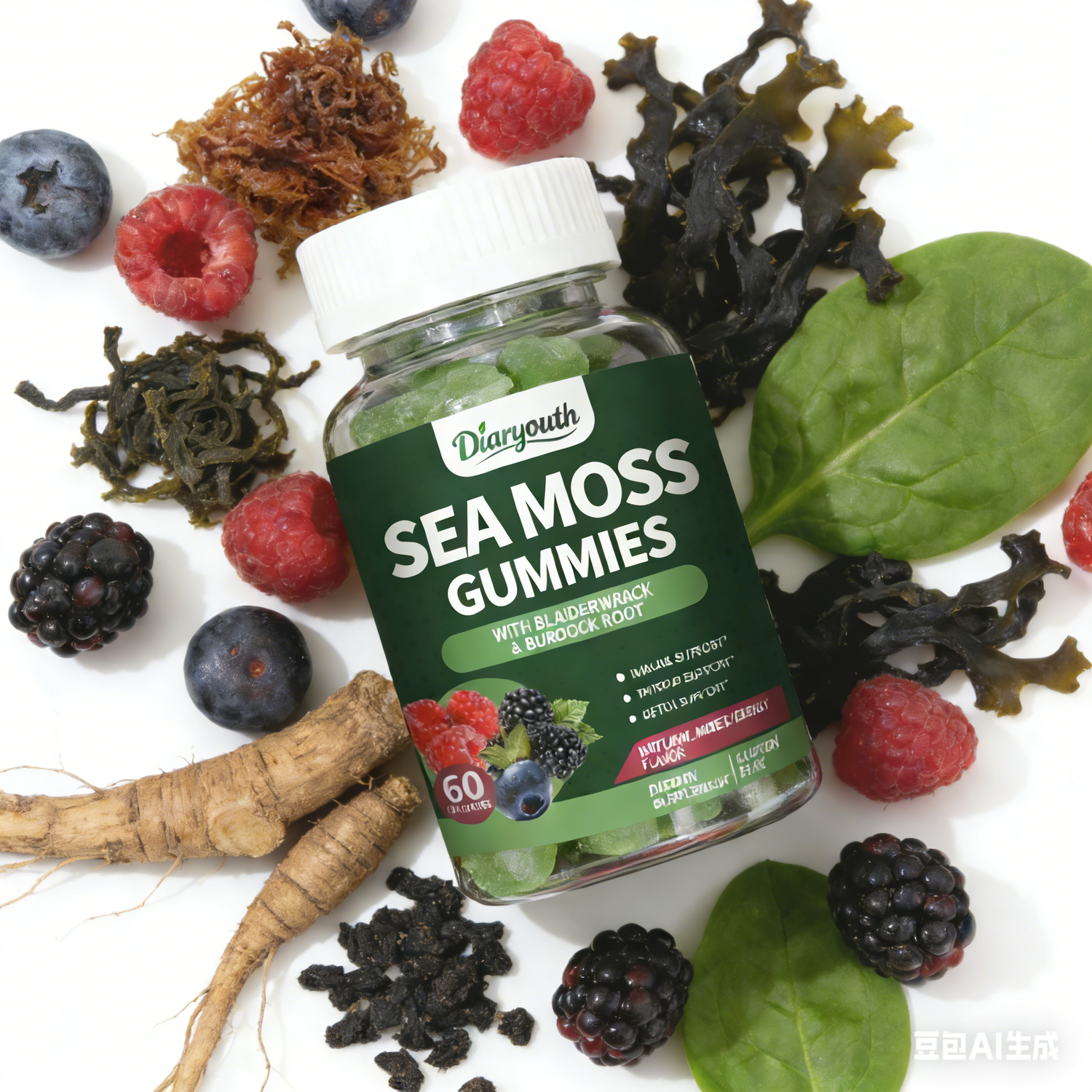 Diaryouth Natural Sea Moss Gummies deliver targeted sexual health support,serve as a powerful immune booster, provide effective detox support and thyroid support, and deliver reliable support for the digestive system, : Irish Sea Moss fuels testosterone production and boosts stamina; Burdock Root enhances blood flow critical for reproductive function; Bladderwrack sustains thyroid health to maintain energy for libido; Spinach Leaf expands blood vessels and elevates physical endurance—all in a natural mixed berry flavor, gluten-free formula.