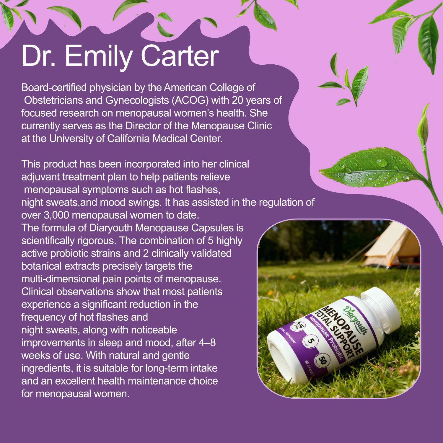 - Holistic Menopause Support: Beyond a mere supplement, our probiotic becomes your daily companion throughout the menopausal journey. Meticulously formulated, it offers versatile symptom support and supports relief.